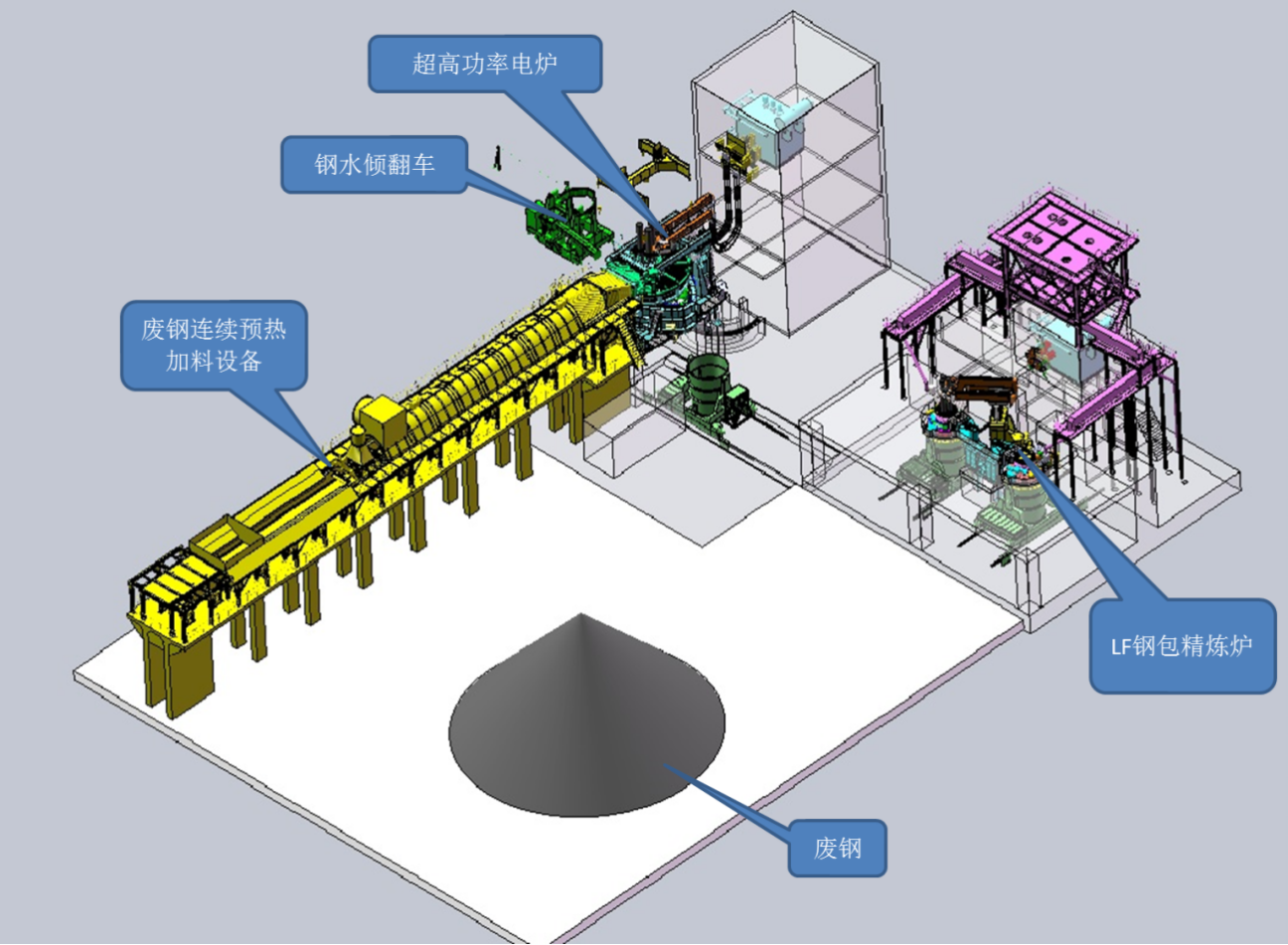 On the basis of digesting and absorbing domestic and foreign technologies, 60t to 150t Ultra-high Power Electric Arc Furnace, LF ladle refining furnace and scrap horizontal continuous preheating and feeding equipment developed by North Heavy Industry Group Co., Ltd. has the process characteristics of continuous feeding, continuous preheating and continuous smelting, realizing the high efficiency,