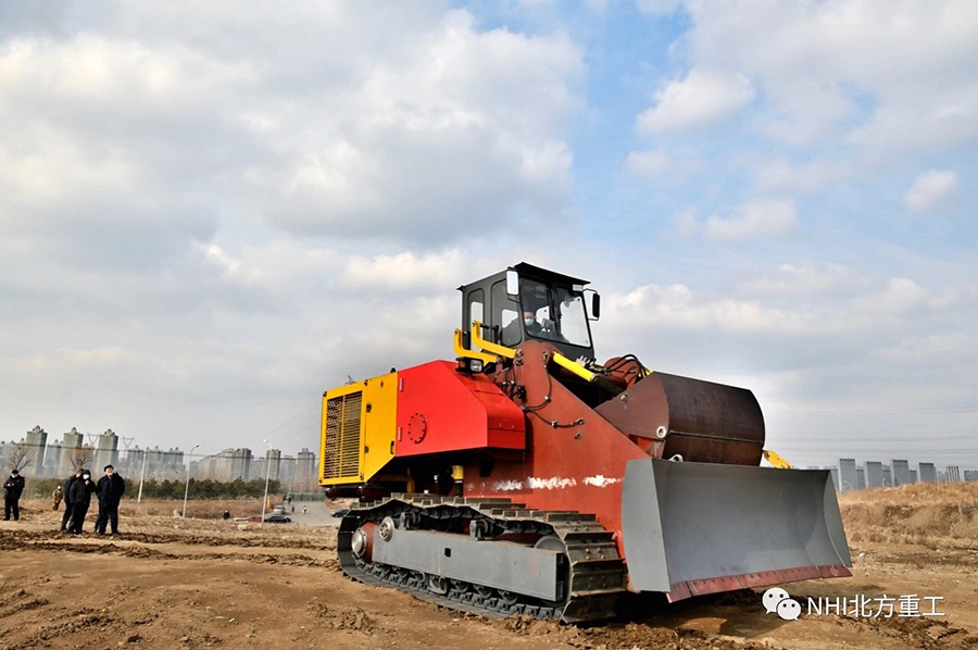 3月1日下午1時,在沈陽南陽湖大橋南側的一座土坡上,由方大集團北方重工自主研發制造,并擁有完全自主知識產權的T12主動式多功能履帶鏟運機正在進行工況條件下的功能測試。伴著轟鳴聲,外形酷似鏟車的鏟運機在駕駛員的操作下,落鏟、前進,留下一條溝槽。溝寬1.98米、溝深300毫米、溝長30米、鏟運機斗容12立方米,隨著測量人員報出的數據,在現場參加測試的用戶與北方重工的員工頓時歡呼雀躍起來,擊掌相慶。