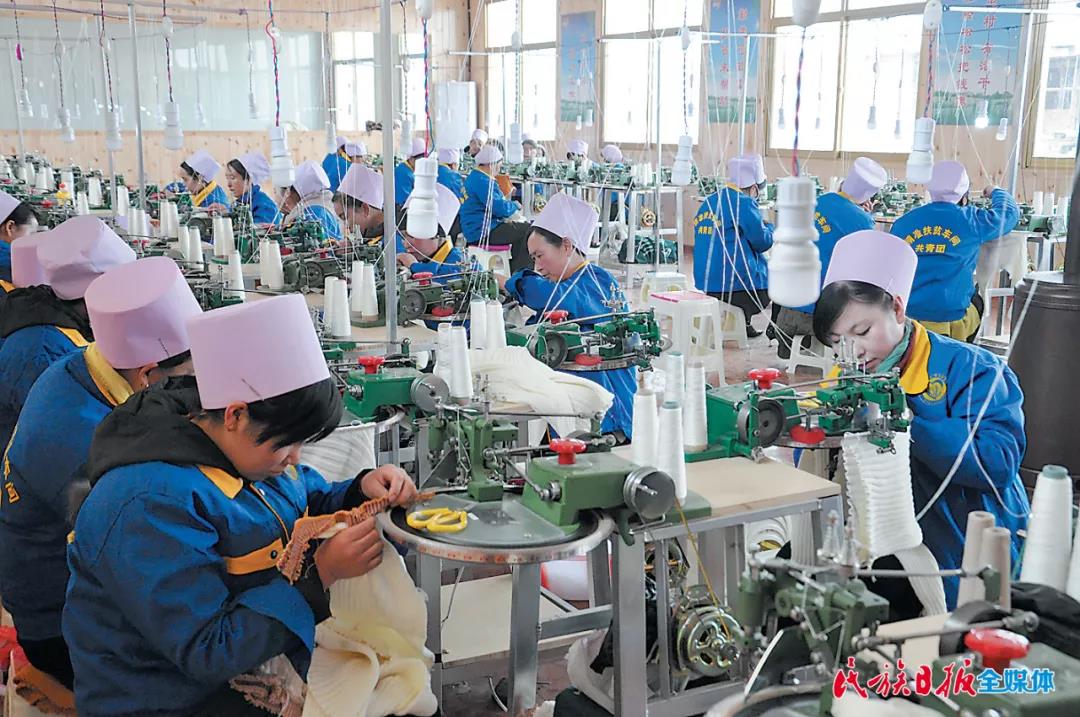 東鄉(xiāng)縣大樹鄉(xiāng)南陽洼村扶貧車間東鄉(xiāng)族工人正在加工毛衣針織品