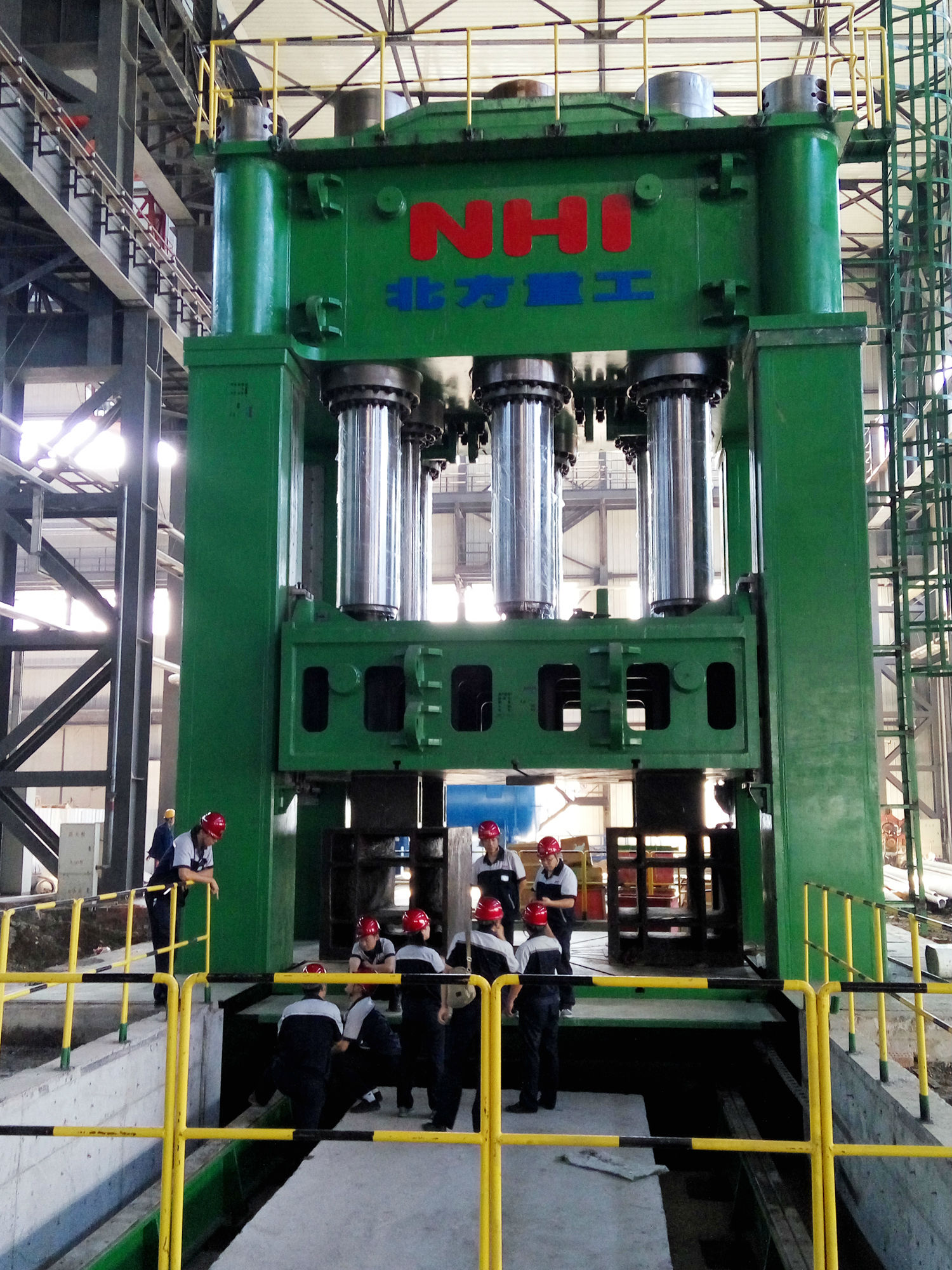 The design and research institute of NHIstarts the development of 70 mn blade hot-pressing molding press, based on the Highquality water turbine blade projects of SHENYANG RESEARCH INSTITUTE OF FOUNDRY.On the basis of accurate simulation calculation, developers adopts virtualprototype technology, optimization design method, innovation of structure form,optimization of control method, which developed the first domestic large-scalehigh quality blade hot-pressing mold molding press, for those technicaldifficulties such as large size blade, high operating temperature, long moldingtime, large horizontal lateral force, and higher precision control.